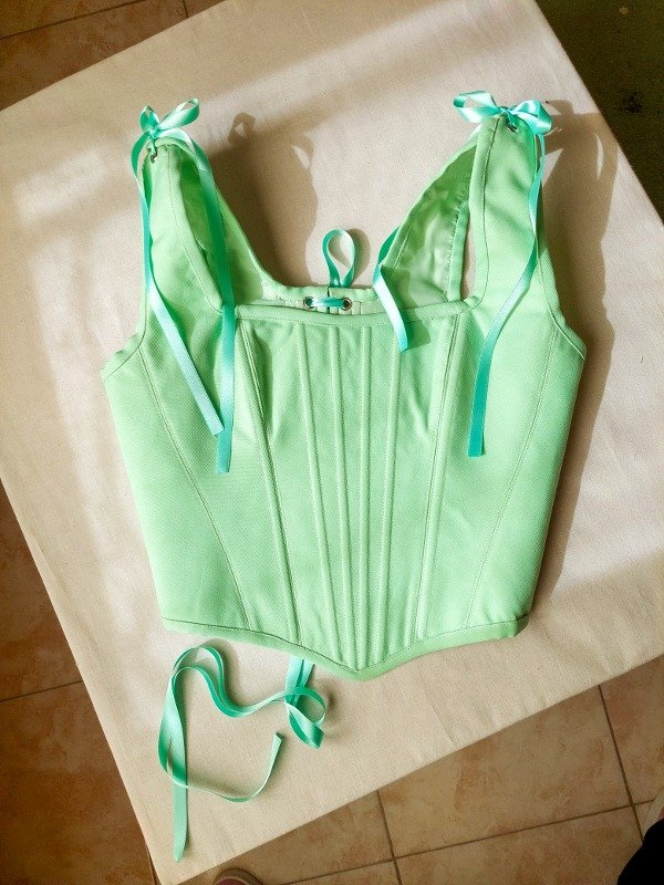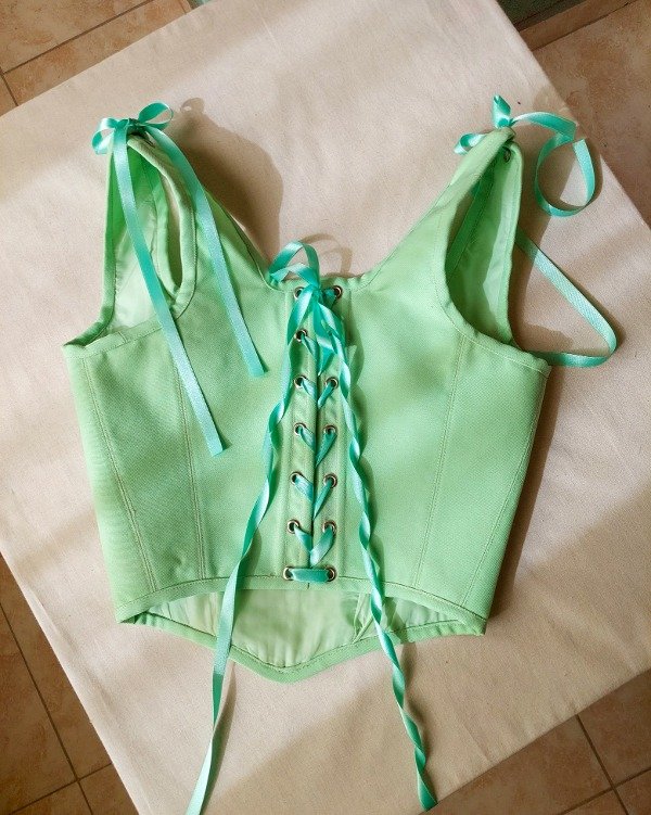 El corset incluye 10 varillas internas que brindan un soporte semi rígido para mantener su forma. Se ajusta en la espalda y en los hombros con cinta de raso, permitiendo una adaptación personalizada.