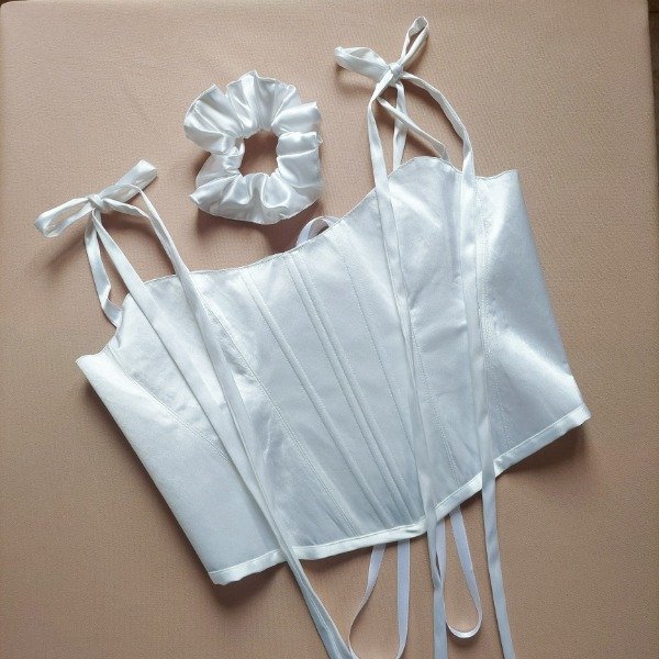 Este corsé está hecho 100% a mano por nosotras. Es una pieza única y exclusiva diseñado en tela razo tornasolado. Su diseño cautivador se complementa con el modelo "Cintas", que se ata en la espalda y los hombros, creando una prenda verdaderamente especial.