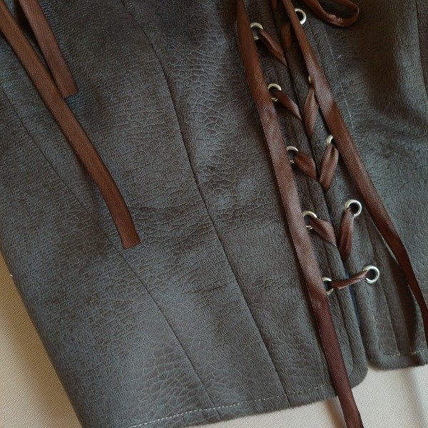 Una prenda única hecha 100% a mano en TELA ecocuero con relieves en tono Marron. Este corset es exclusivo e irrepetible: no hay dos iguales.