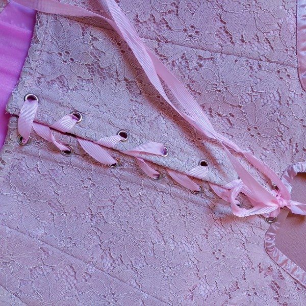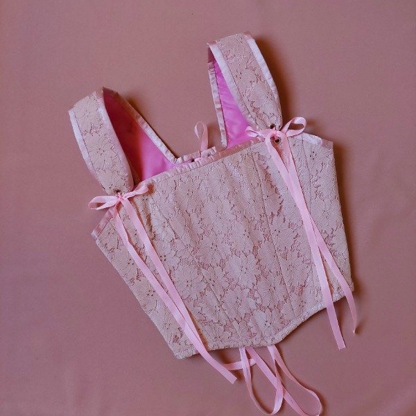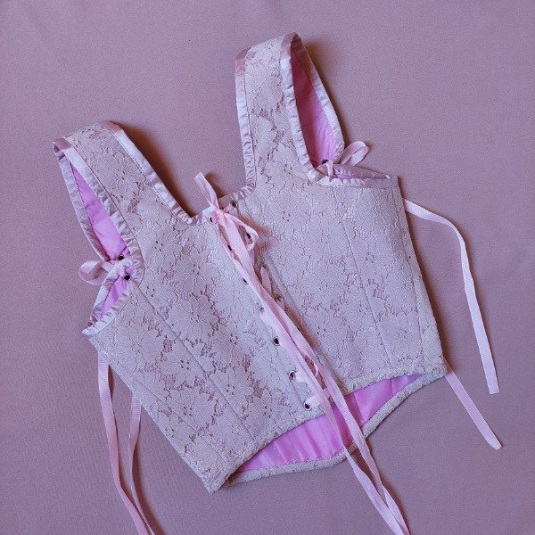 Este corsé está hecho 100% a mano por nosotras. Es una pieza única y exclusiva confeccionada con tela satinada con una capa de encaje de flores en color Rosa palido. Su diseño cautivador se complementa con el modelo "Romántico", que se ata en el frente, creando una prenda verdaderamente especial.